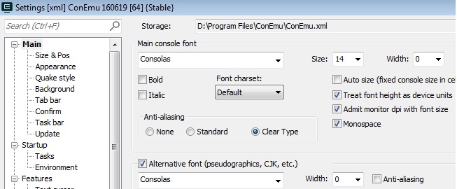 - 基本确信当前乱码的问题在什么地方:当前用来执行程序的CLI的编码方式不是utf-8,所以才显示乱码。查看当前使用命令行工具ConEmu的配置,Font charset设置为“Default”,而其中的可选字符集并没有utf-8,基本确认问题为CLI的字符编码不匹配。
