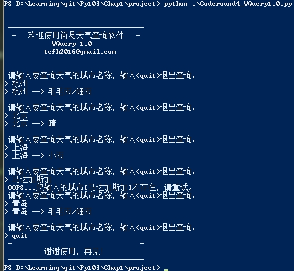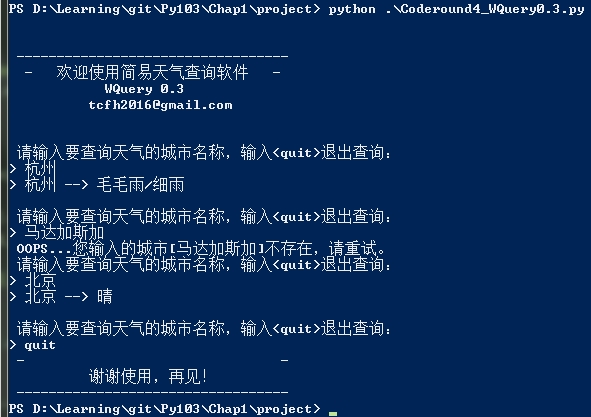 我要回家吃饭!... 我先简单点儿了,仅仅针对不存在的城市提供错误提示,软件版本递进到0.3,运行效果如下:
